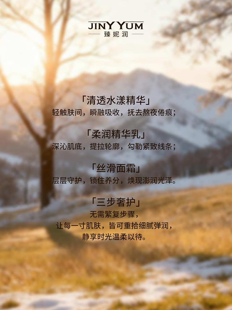 时光悄然,肌颜渐失光采。 臻妮润展颜套装,以匠心凝萃自然能量,为肌肤注入澎弹活力💧。 💧清透水漾精华 轻触肤间,瞬融吸收,抚去熬夜倦痕😴✨。 🌿柔润精华乳 深沁肌底,提拉轮廓,勾勒紧致线条🧘♀️💪。 💎丝滑面霜 层层守护,锁住养分,焕现澎润光泽🌟。 三步奢护,无需繁复步骤,让每一寸肌肤,皆可重拾细腻弹润,静享时光温柔以待💕。
